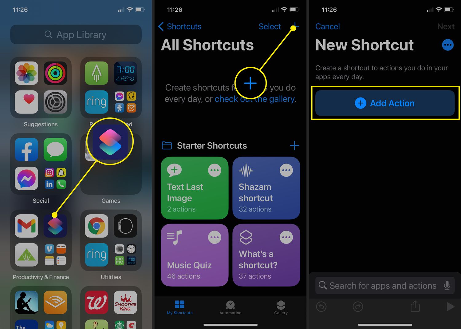 - Tap the “+” icon in the upper right corner to create a new shortcut.